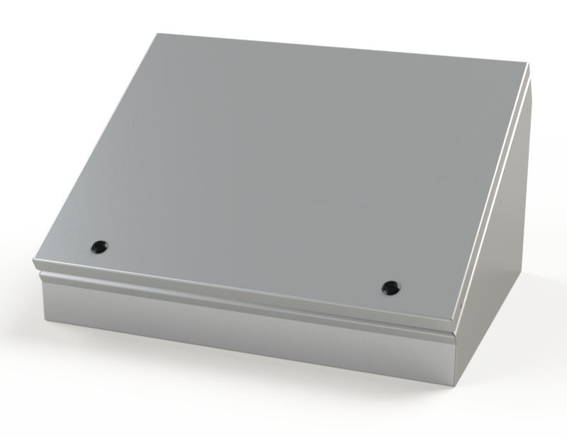 Designed to house electrical and electronic controls, instruments, and components. Provides protection from dust, dirt, oil and water. Consolets can be mounted on either of two sides to give a control surface inclined 30 degrees or 60 degrees. Can be mounted on desks, machines, or pedestals (not included).
