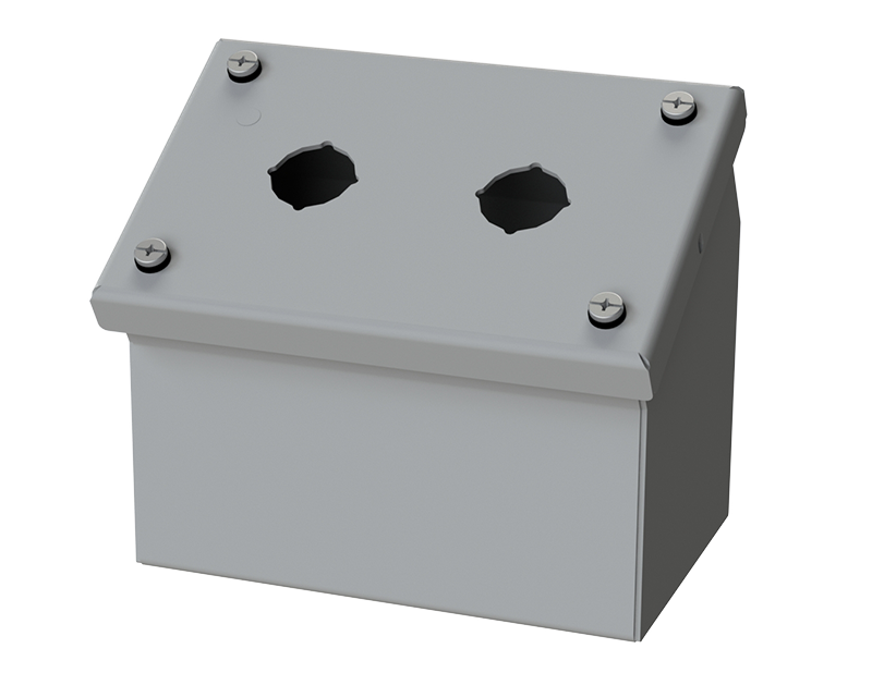 Designed to offer protection for all standard brands of oil-tight pushbuttons, switches, and pilot lights where slanted surfaces are desired. It offers protection from dust, dirt, oil and water.
