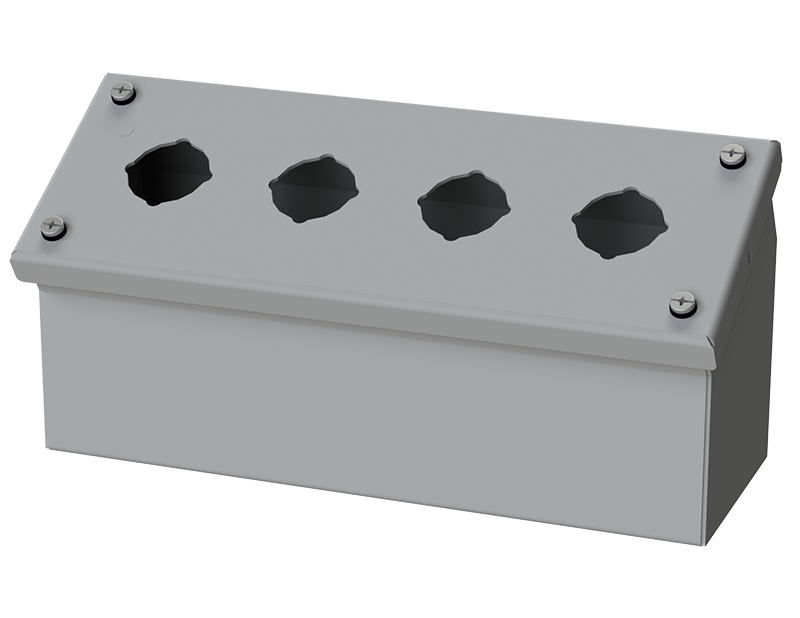 Designed to offer protection for all standard brands of oil-tight pushbuttons, switches, and pilot lights where slanted surfaces are desired. It offers protection from dust, dirt, oil and water.