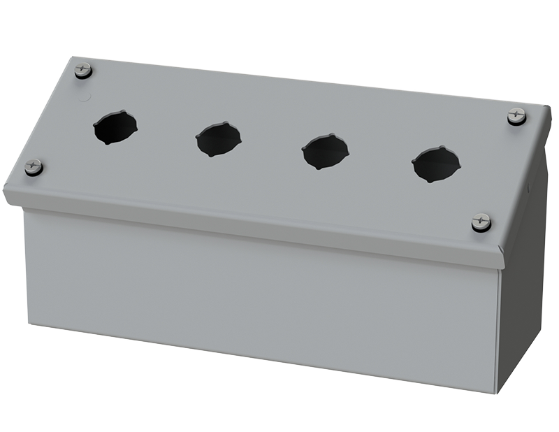 Designed to offer protection for all standard brands of oil-tight pushbuttons, switches, and pilot lights where slanted surfaces are desired. It offers protection from dust, dirt, oil and water.