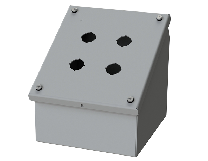 Designed to offer protection for all standard brands of oil-tight pushbuttons, switches, and pilot lights where slanted surfaces are desired. It offers protection from dust, dirt, oil and water.