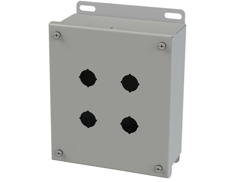 - 4-way standard pushbutton holes accept all brands of oil-tight pushbuttons, switches, and pilot lights. Hole diameter is 0.87 In. (22.5mm).