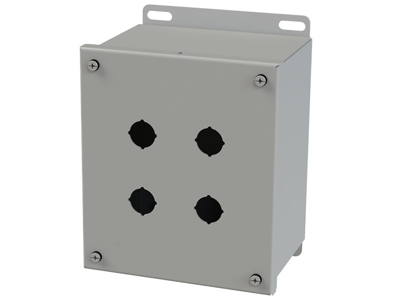 - 4-way standard pushbutton holes accept all brands of oil-tight pushbuttons, switches, and pilot lights. Hole diameter is 0.87 In. (22.5mm).