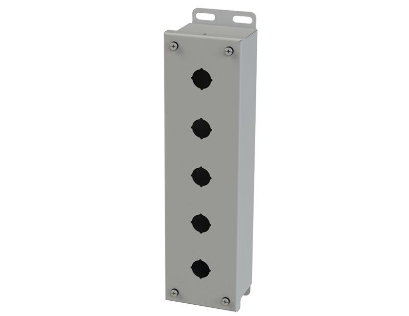 - 4-way standard pushbutton holes accept all brands of oil-tight pushbuttons, switches, and pilot lights. Hole diameter is 0.87 In. (22.5mm).