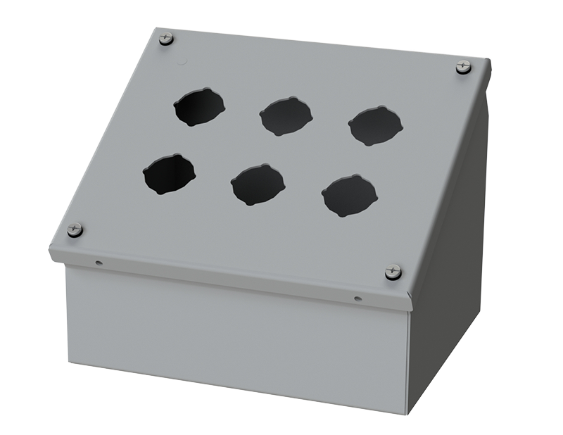 Designed to offer protection for all standard brands of oil-tight pushbuttons, switches, and pilot lights where slanted surfaces are desired. It offers protection from dust, dirt, oil and water.