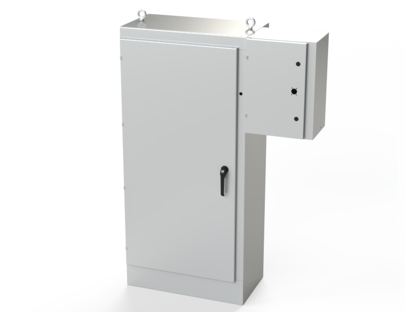 Designed to house the main power supply in external enclosure on the right side of main enclosure, keeping the live side of the power supply separate from the primary electrical equipment. Provision for Compact Fusible Disconnect with Rotary handle Disconnect 30 to 200 amp Allen-Bradley 194R, Square D GS2, Eaton/Bussmann R9, Siemens CFS models and Socomec Fuserbloc models. Provides protection from dirt, dust, oil and water. For outdoor application a drip shield and drain vent is recommended.