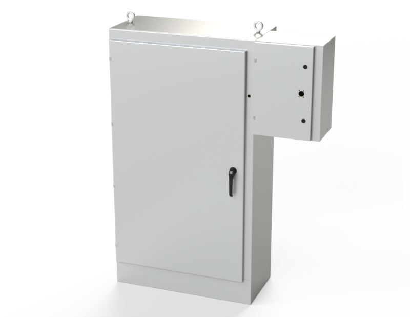 Designed to house the main power supply in external enclosure on the right side of main enclosure, keeping the live side of the power supply separate from the primary electrical equipment. Provision for Compact Fusible Disconnect with Rotary handle Disconnect 30 to 200 amp Allen-Bradley 194R, Square D GS2, Eaton/Bussmann R9, Siemens CFS models and Socomec Fuserbloc models. Provides protection from dirt, dust, oil and water. For outdoor application a drip shield and drain vent is recommended.