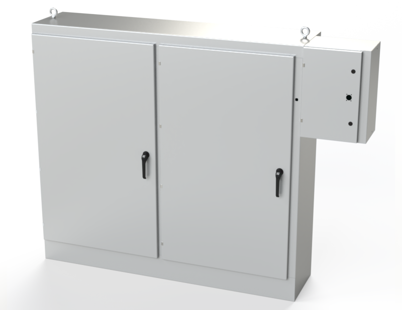 Designed to house the main power supply in external enclosure on the right side of main enclosure, keeping the live side of the power supply separate from the primary electrical equipment. Provision for Compact Fusible Disconnect with Rotary handle Disconnect 30 to 200 amp Allen-Bradley 194R, Square D GS2, Eaton/Bussmann R9, Siemens CFS models and Socomec Fuserbloc models. Provides protection from dirt, dust, oil and water. For outdoor application a drip shield and drain vent is recommended.
