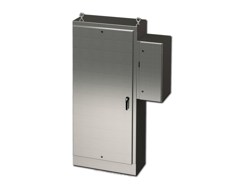 Designed to house the main power supply in external enclosure on the right side of main enclosure, keeping the live side of the power supply separate from the primary electrical equipment. Provides protection from dirt, dust, oil and water and can house most standard type disconnects. For outdoor application a drip shield and drain vent is recommended.