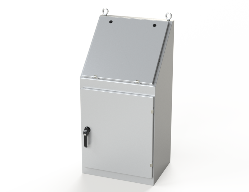 Designed for electronic controls and instruments. Equipment can be mounted on the sloping control panel door. Interior components mount to stationary panels. Provides protection from dirt, oil, dust and water.