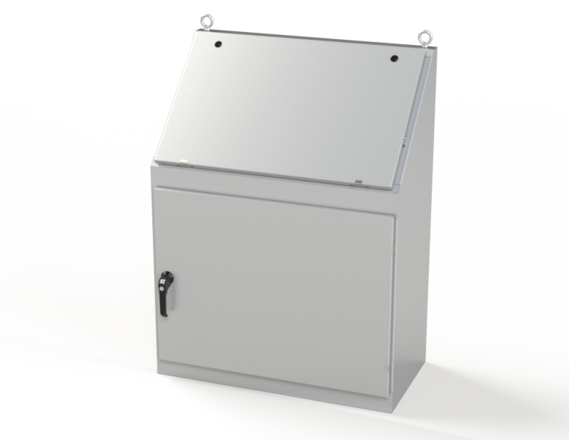 Designed for electronic controls and instruments. Equipment can be mounted on the sloping control panel door. Interior components mount to stationary panels. Provides protection from dirt, oil, dust and water.
