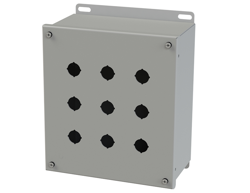 - 4-way miniature pushbutton holes accept all brands of oil-tight pushbuttons, switches and pilot lights. Hole diameter is 0.87 in.