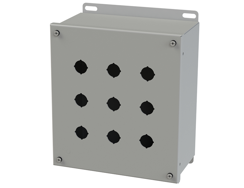 - 4-way standard pushbutton holes accept all brands of oil-tight pushbuttons, switches, and pilot lights. Hole diameter is 0.87 In. (22.5mm).