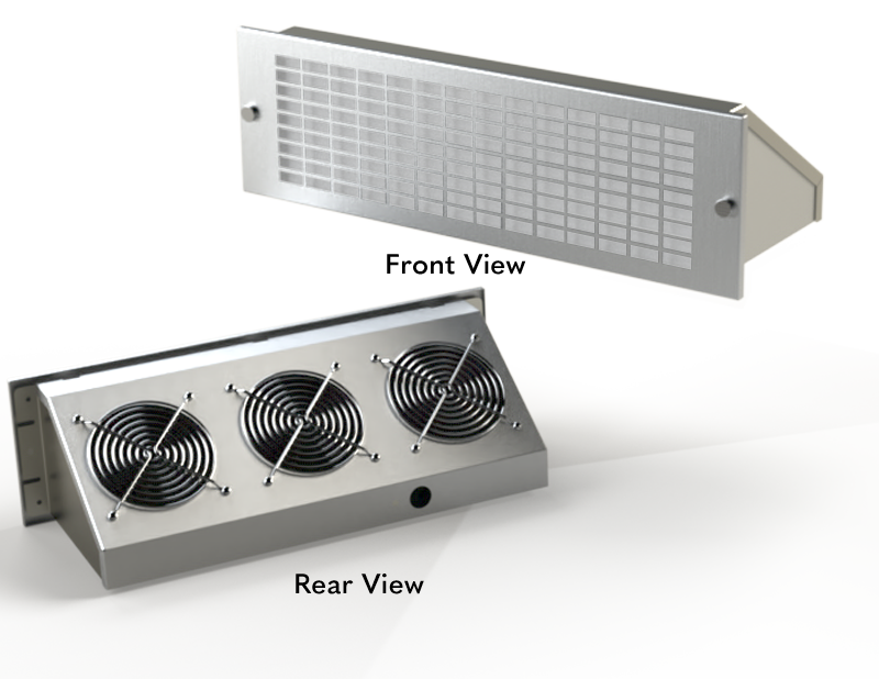 Designed for use in enclosures that require cooling but have limited space. Consists of a washable aluminum air filter, steel air plenum, removable stainless steel grille. Grille has captivated thumbnuts for easy access to the filter from the outside. Fan is 115 or 230 volt AC 60/50 Hertz (HZ). The 125 degree angled design provides greater air movement within the enclosure. Air plenum is ANSI 61 gray urethane polyester powder coated.