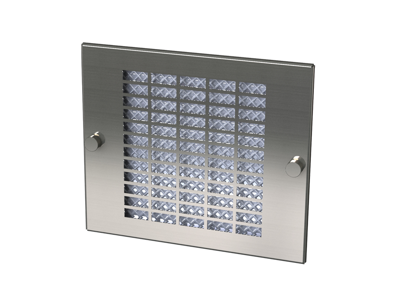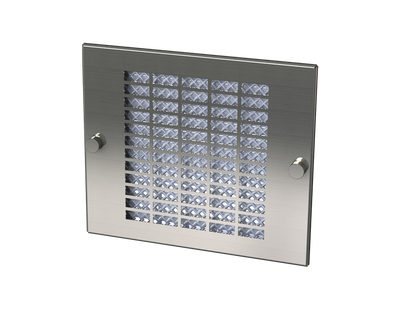 Designed for use on air discharge side of fan package. Stainless steel grille with captivated thumb screws. Aluminum mounting brackets and aluminum filter. Mounting hardware is included.