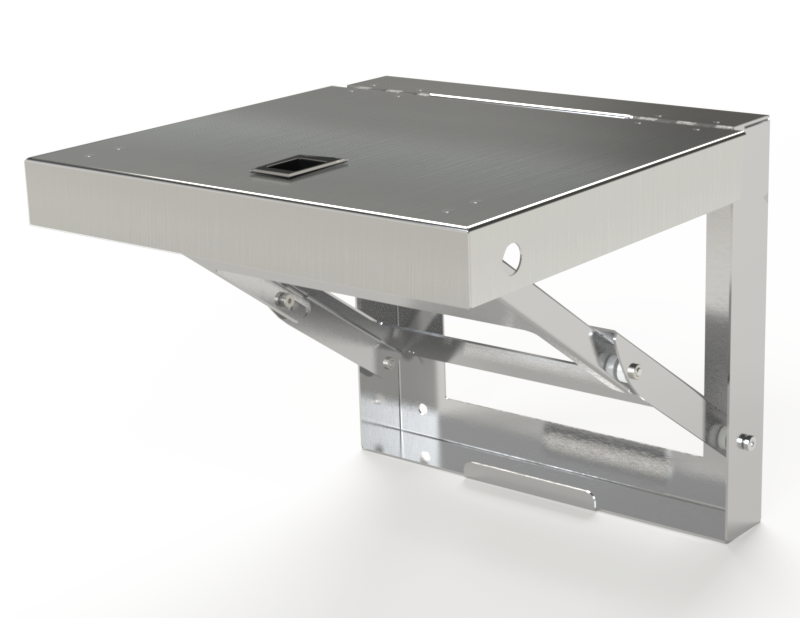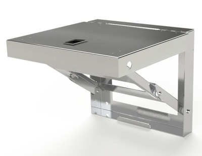 Folding shelves can be installed on the inside or outside of large enclosures. They are designed to support test equipment and programmers. Locks in the horizontal position. When not in use, shelf can be folded down. Made of heavy gauge steel and powder coated. "SS" parts are stainless steel Type 304 with #4 brush finish.