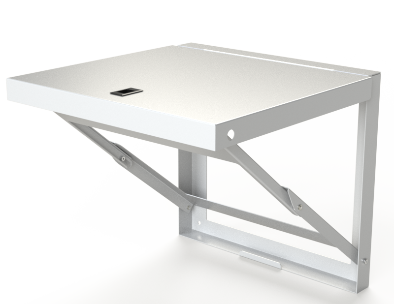 Folding shelves can be installed on the inside or outside of large enclosures. They are designed to support test equipment and programmers. Locks in the horizontal position. When not in use, shelf can be folded down. Made of heavy gauge steel and powder coated. "SS" parts are stainless steel Type 304 with #4 brush finish.