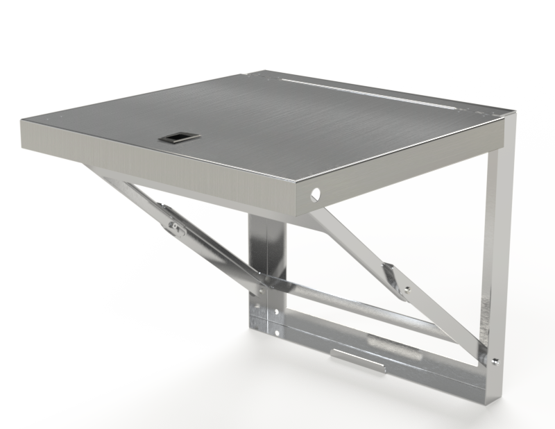 Folding shelves can be installed on the inside or outside of large enclosures. They are designed to support test equipment and programmers. Locks in the horizontal position. When not in use, shelf can be folded down. Made of heavy gauge steel and powder coated. "SS" parts are stainless steel Type 304 with #4 brush finish.