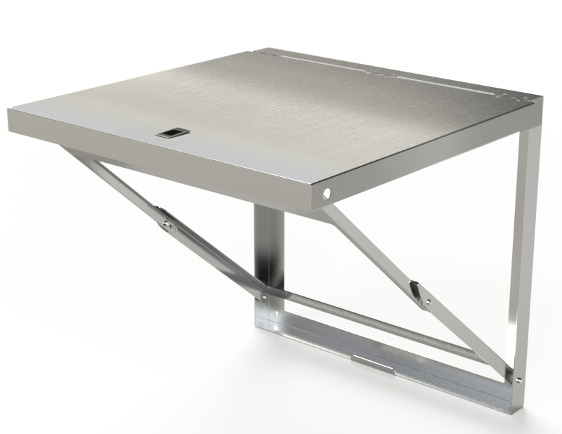 Folding shelves can be installed on the inside or outside of large enclosures. They are designed to support test equipment and programmers. Locks in the horizontal position. When not in use, shelf can be folded down. Made of heavy gauge steel and powder coated. "SS" parts are stainless steel Type 304 with #4 brush finish.