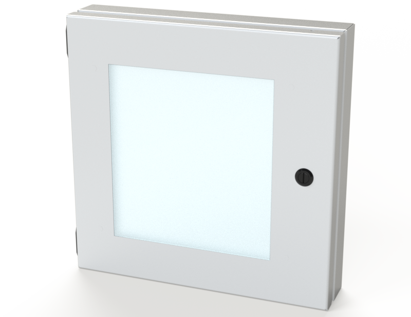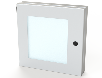 Designed to mount on the exterior of an enclosure to provide protection for controls with easy access. ELJ hinges. Black mini quarter turn latches. UV stable polycarbinate viewing window. Gasket and hardware included. For outdoor application a drip shield and drain vent is recommended.