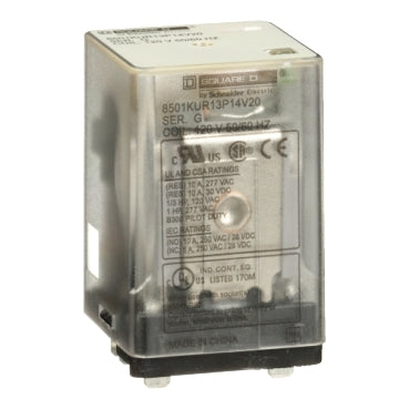 8501KUR13P14V20 | General Purpose Plug-In Relay Blade, 3PDT, 120V AC, 10A at 250V AC, Clear Cover, LED | Square D by Schneider Electric