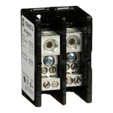 Linergy power distribution blocks are for terminating wires and are designed to NEMA standards. This two pole block has one lug opening on the line (main) side and four lug openings on the load (branch) side. The line side lug is rated to accept one #14 to 2/0 copper or aluminum wires. Each load side lug is rated to accept one #14 to #4 copper or aluminum wire. The lugs are made of aluminum. The lugs are rated for 175 amperes with copper wire and 135 amperes with aluminum wire. The lugs are rated to 600 volts. The housing is made of high impact thermoplastic. These Linergy power distribution blocks are UL component recognized and CSA certified.Specifications
