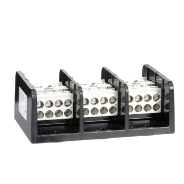 Linergy power distribution blocks are for terminating wires and are designed to NEMA standards. This three pole block has two lug openings on the line (main) side and eight lug openings on the load (branch) side. The line side lug is rated to accept one #6 to 500 kcmil copper or aluminum wire. The load side lugs are rated to accept one #14 to 2/0 copper or aluminum wire. The lugs are made of aluminum. The lugs are rated for 760 amperes with copper wire and 620 amperes with aluminum wire. The lugs are rated to 600 volts. The housing is made of general purpose phenolic. These Linergy power distribution blocks are UL component recognized and CSA certified.Specifications