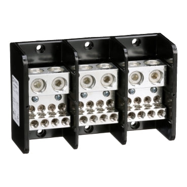 Linergy power distribution blocks are for terminating wires and are designed to NEMA standards. This three pole block has two lug openings on the line (main) side and eight lug openings on the load (branch) side. The line side lug is rated to accept one #4 to 500 kcmil copper wire. The load side lug is rated to accept one #14 to 2/0 copper wire. The lugs are made of copper. The lugs are rated for 760 amperes with copper wire. The lugs are rated to 600 volts. The housing is made of general purpose phenolic. These Linergy power distribution blocks are UL component recognized and CSA certified.Specifications