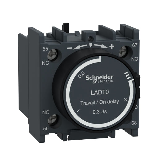 TeSys Deca time delay auxiliary contact block, for contactors LC1D, LC1F and control relays CAD. It provides 1NO+1NC contacts rated up to 10A 690V AC, On-delay setting range 0.3-3s, connection by screw clamp terminals. Clip-on front mounting, it procures high reliability and durability. Multi standards certified (IEC, UL, CSA, CCC, EAC), Green Premium compliant (RoHs/Reach).Specifications