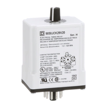 9050JCK29V20 | Timing Relay, Type JCK, plug In, off delay, adjustable time, 1.2 to 120 minutes, 10A, 240 VAC, 120 VAC/110 VDC | Square D by Schneider Electric