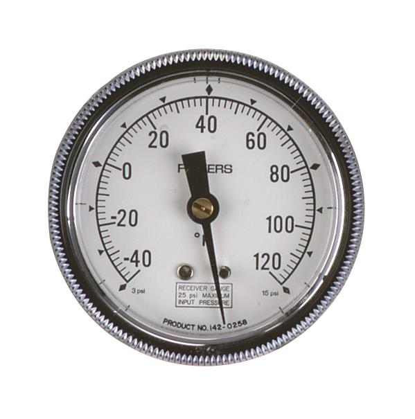 This 142A Pneumatic Receiver Gauge is mounted on a central control panel and responds to pneumatic signals from a remotely-located transmitter used to measure temperatures, humidity and pressures of mechanical equipment. This 1-1/2 inch (64 mm) diameter receiver gauge has a control range of -40 to 160 degrees Fahrenheit, a 1/8-inch NPT male connection in the center of the back housing and a standard operating pressure of 3 to 15 psi. It is 1 inch wide, 1.63 inches tall and 1 inch deep.