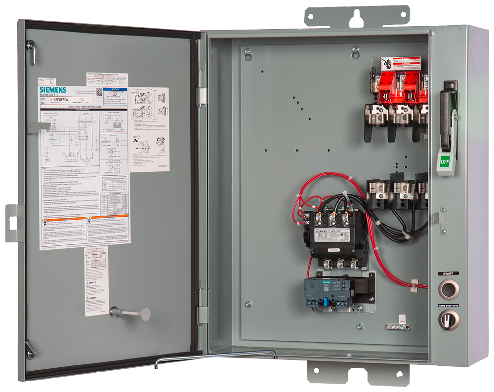 Pump control panel Size 2 1/2 H2 Solid-state overload relay OLR amp range 25-100A 380-440/440-480V 50/60Hz Coil Standard type contactor 100A fusible disconnect 60A/250V fuse clip HOA sel. sw. <(><<)>(><(>&<)><(><<)>)> Start/Stop P.B. Enclosure NEMA type 3/3R Weather proof outdoor use