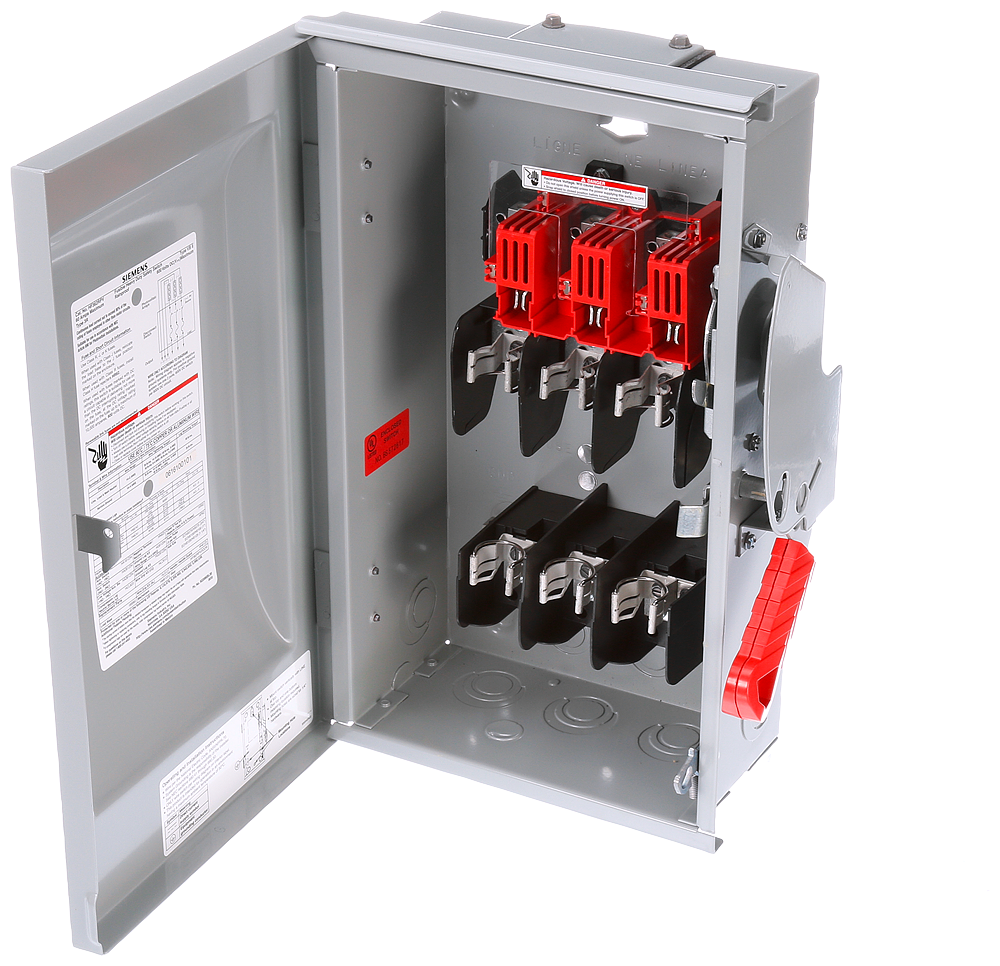 Siemens Low Voltage Circuit Protection Heavy Duty Safety Switch. 3-Pole 3-Fuse Fused in a type 3R enclosure (outdoor). Rated 600VAC (60A).