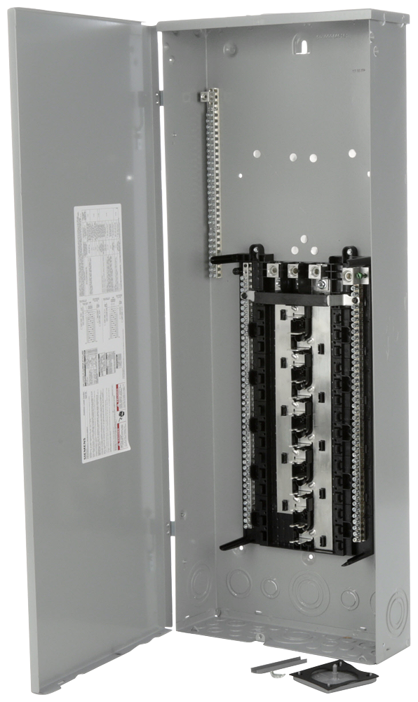 SIEMENS LOW VOLTAGE PL SERIES LOAD CENTER. MAIN LUG WITH 30 1-INCH SPACES ALLOWING MAX 54 CIRCUITS. 3-PHASE 4-WIRE SYSTEM RATED 120/240V OR 120/208V (200A) 100KA INTERRUPT. SPECIAL FEATURES: COPPER BUS, INTERCHANGEABLE MAIN, GRAY TRIM, NEMA TYPE3R ENCLOSURE FOR OUTDOOR USE.