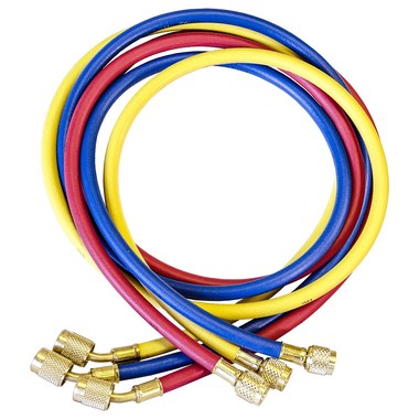 Charge securely with the CCLL-72 Charging Hose Set, a high-performance solution for industrial refrigeration applications from J/B Industries. This 72-inch hose set features a Kevlar construction for exceptional strength and durability. Its Red/Yellow/Blue color coding provides easy identification during use. With a maximum pressure of 800 PSI, the CCLL-72 set is ideal for use with R410A refrigerants.