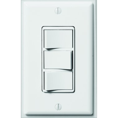 This switch features a 1-pole/double-throw On-Off-On top switch and two 1-pole ON-OFF switches, allowing for versatile control of ventilation functions. Its elegant decorator styling enhances any decor.
