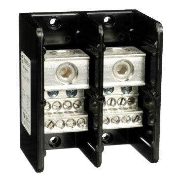 Linergy power distribution blocks are for terminating wires and are designed to NEMA standards. This two pole block has one lug opening on the line (main) side and eight lug openings on the load (branch) side. The line side lug is rated to accept one #4 to 600 kcmil copper or aluminum wire. The load side lug is rated to accept one #14 to #2 copper or aluminum wire. The lugs are made of aluminum. The lugs are rated for 335 amperes with copper wire and 270 amperes with aluminum wire. The lugs are rated to 600 volts. The housing is made of general purpose phenolic. These Linergy power distribution blocks are UL component recognized and CSA certified.Specifications