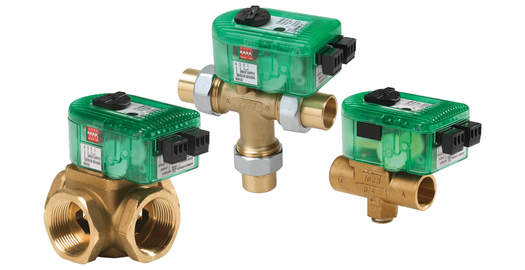 Taco iSeries ® Mixing Valves provide precise and cost-effective temperature control for your heating systems, the flexibility of zone-to-zone control, plus built-in protection against boiler flue gas condensation. Available in 2-way, 3-way or 4-way injection configurations, for either outdoor reset control or fixed water supply temperature applications, and operate off constant power or relay end switch. Features include a ball valve design, High Cv, manual operation button, solid-state microprocessor, multi-status LED indicator light and easy, one-hand actuator removal.