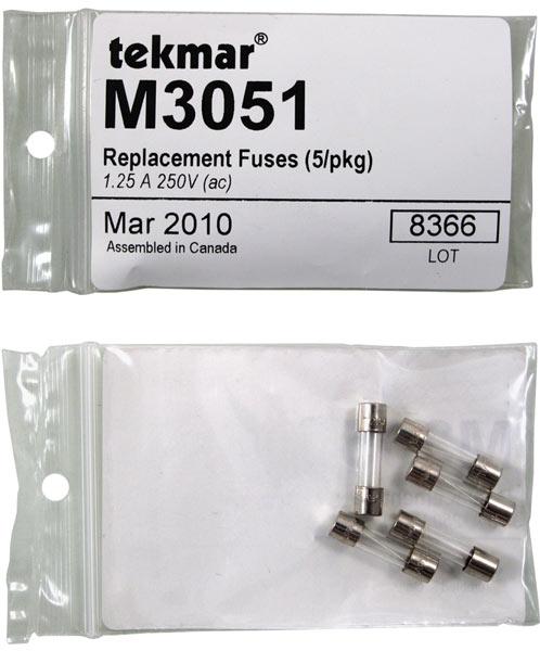 The Replacement Fuses Kit M3051 consist of a package of five 1.25 A 250 V (ac) fuses. These fuses are to replace damaged or blown fuses on various controls which use them.