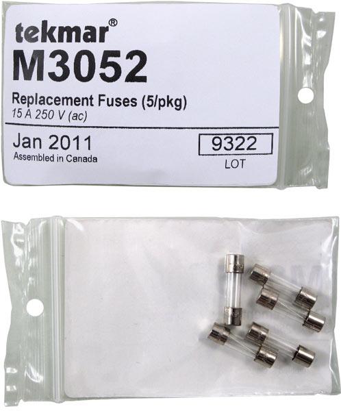 The Replacement Fuses Kit M3052 consist of a package of five 15 A 250 V (ac) fuses. These fuses are to replace damaged or blown fuses on various controls which use them.